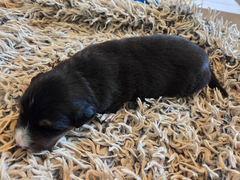 SOLD. Meet Moosey He is a Black Tri with a tail. He does have his dew claws removed. He was born last but is the biggest in his litter